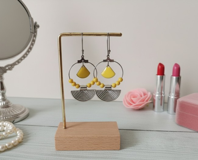 Boucles d'oreilles créoles acier inoxydable, pendentif demi lune et sequin émail jaune