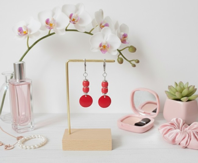 Boucles d'oreilles acier inoxydable et sequin émail rouge