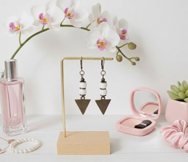 Boucles d'oreilles pendentif bronze et perles colonne blanche