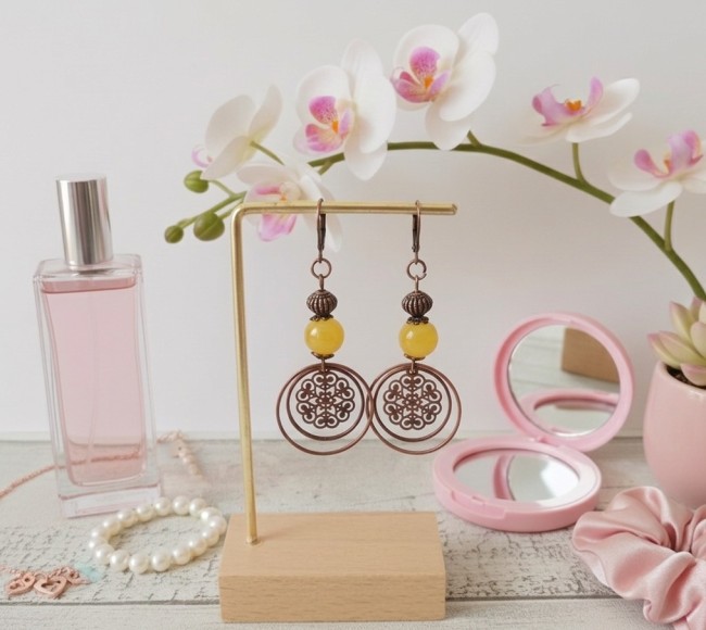 Boucles d'oreilles perles imitation jade jaune moutarde et anneaux cuivre rouge