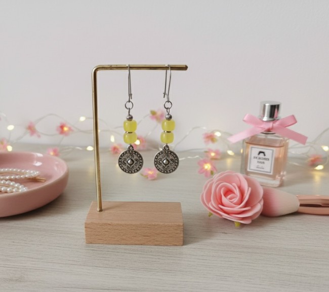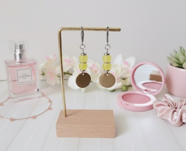 Boucles d'oreilles acier inoxydable, pendentif rond et perles colonnes jaunes