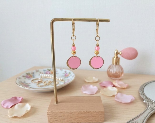 Boucles d'oreilles anneaux doré et sequin émail rose