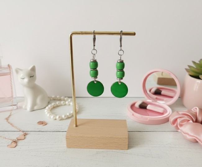 Boucles d'oreilles acier inoxydable, sequin métal et perles colonnes vertes