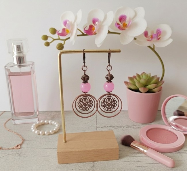 Boucles d'oreilles perles imitation jade rose et anneaux cuivre rouge