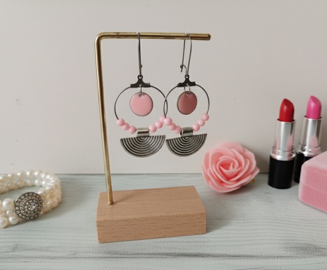 Kit boucles d'oreilles anneaux doré et sequin émail rose