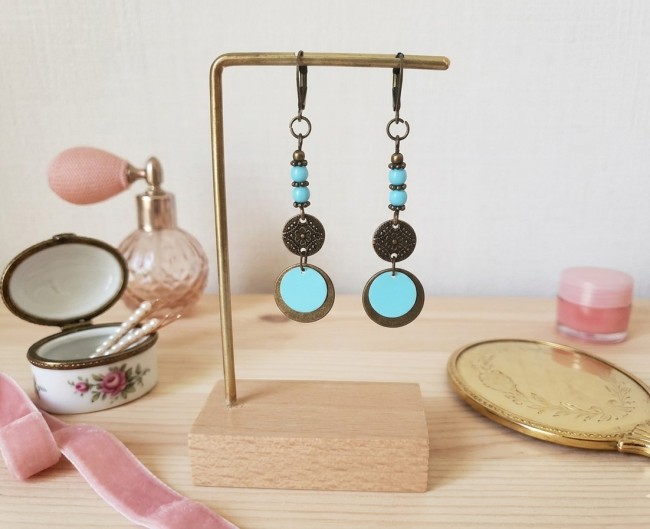 Boucles d'oreilles perles bleues dur imitation jade et apprêts bronzes