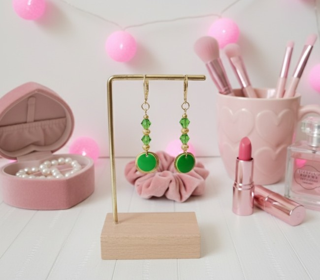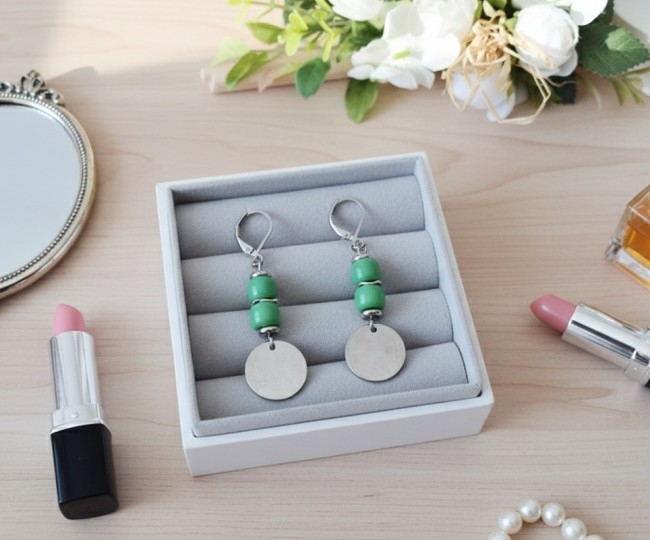 Boucles d'oreilles acier inoxydable, sequin métal et perles colonnes vertes