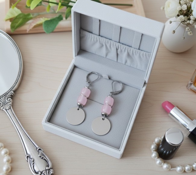 Boucles d'oreilles acier inoxydable, sequin métal et perles colonnes rose
