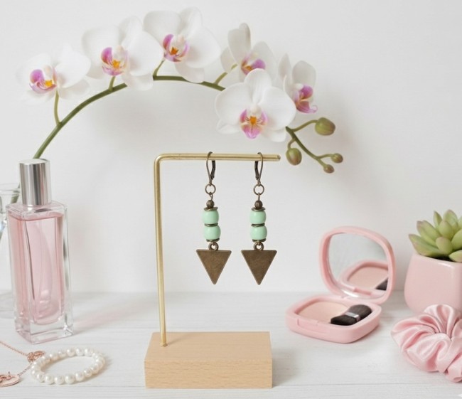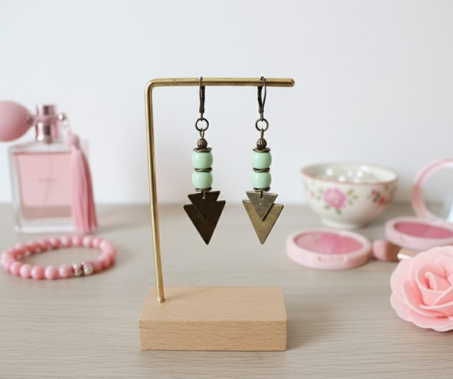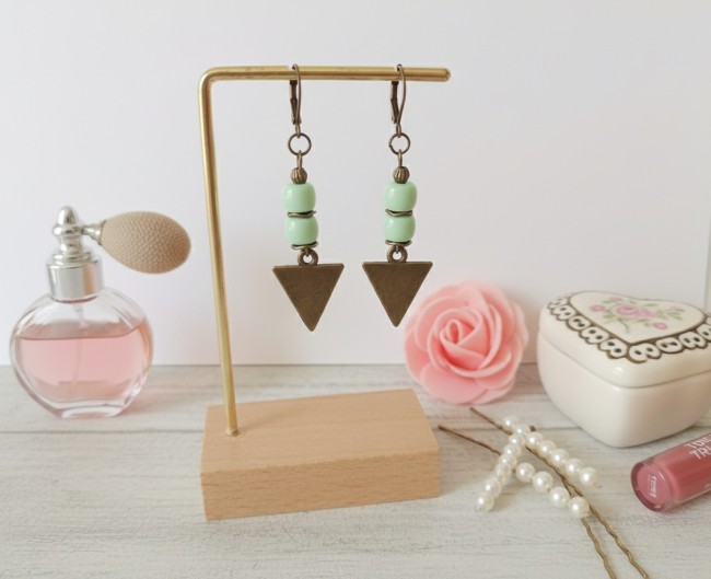 Boucles d'oreilles pendentif bronze et perles colonne vert clair