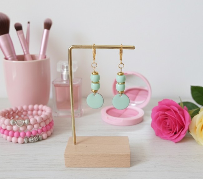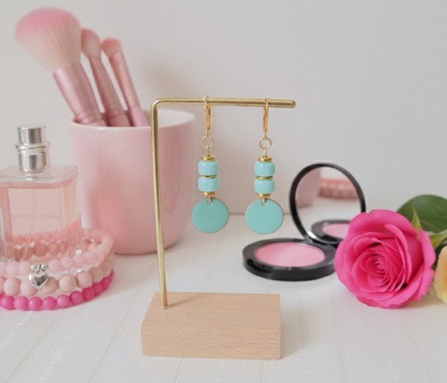 Boucles d'oreilles pendentif émail et perles rondelles bleu vert