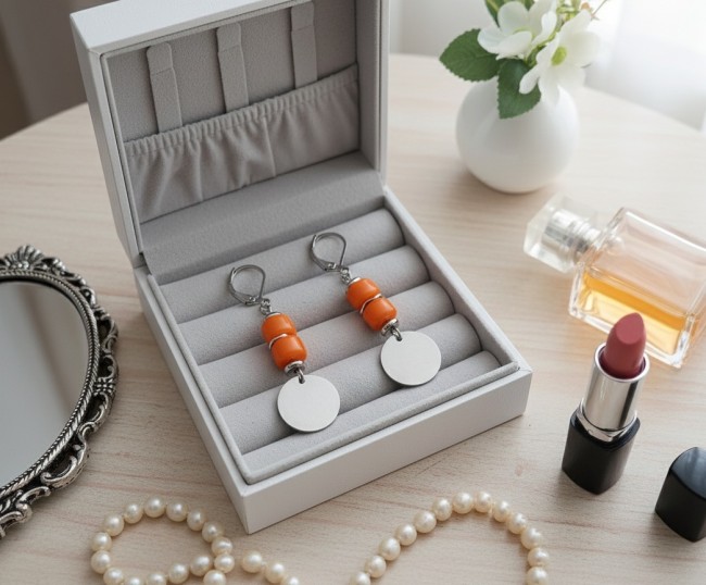 Boucles d'oreilles acier inoxydable, sequin métal et perles colonnes oranges