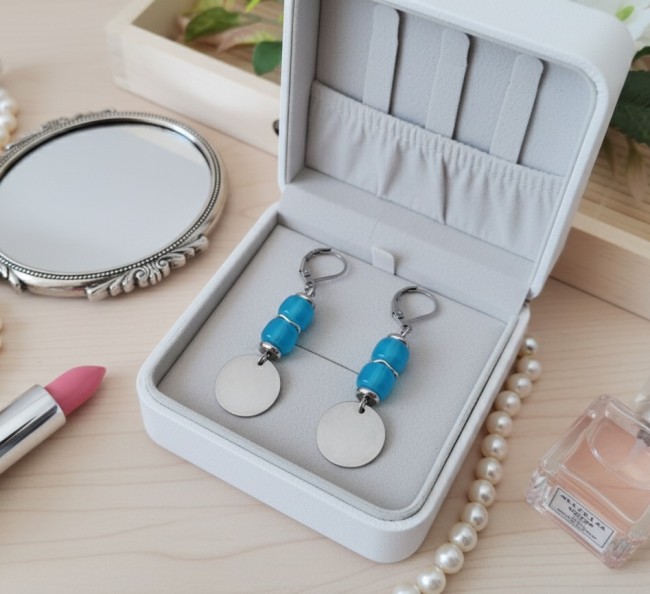 Boucles d'oreilles acier inoxydable, sequin métal et perles colonnes bleues