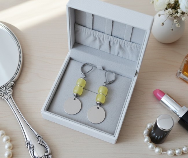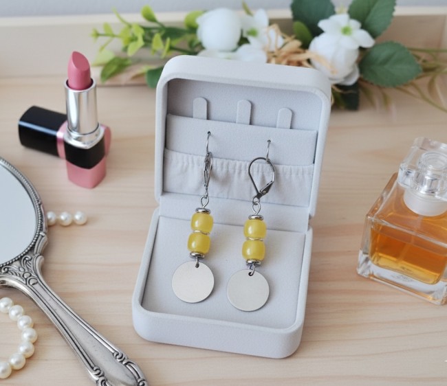 Boucles d'oreilles acier inoxydable, sequin métal et perles colonnes jaune clair