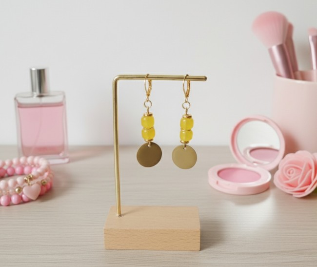 Boucles d'oreilles acier inoxydable, sequin métal et perles colonnes jaune soleil