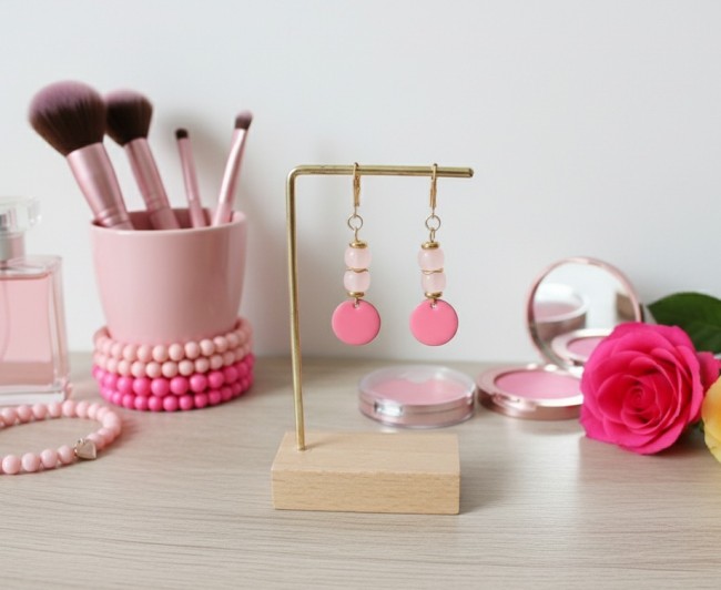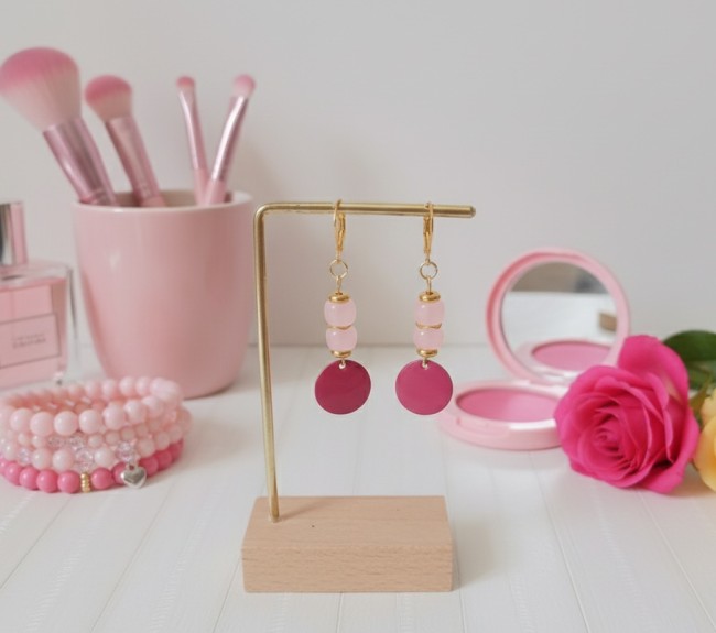 Kit boucles d'oreilles pendentif métal et perles colonnes rose