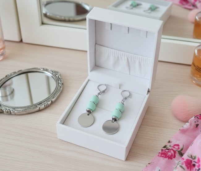 Boucles d'oreilles acier inoxydable, sequin métal et perles colonnes vert anis