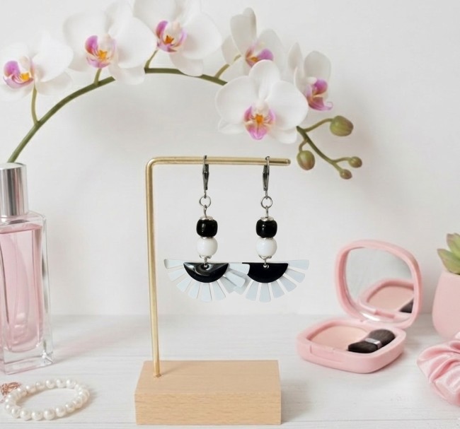 Boucles d'oreilles acier inoxydable et pendentif aile noire/sequin émail blanc