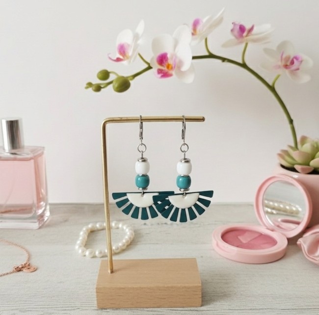 Boucles d'oreilles acier inoxydable et pendentif éventail blanc