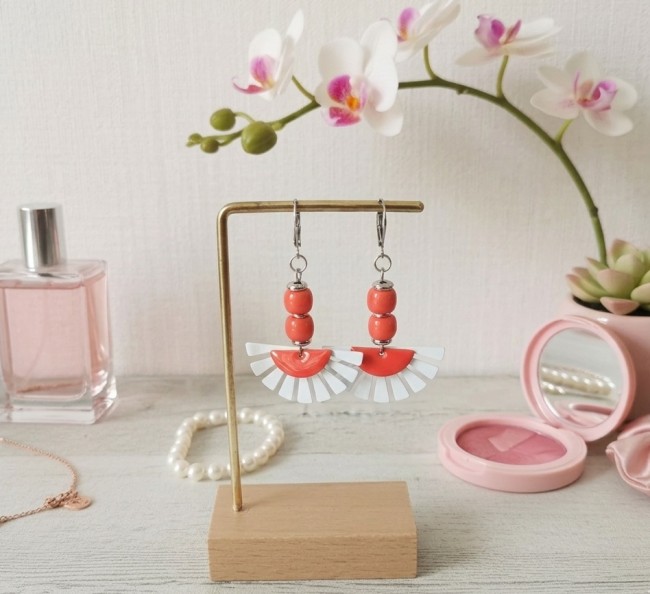Boucles d'oreilles acier inoxydable et pendentif émail corail