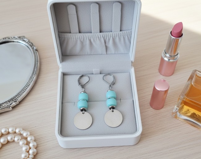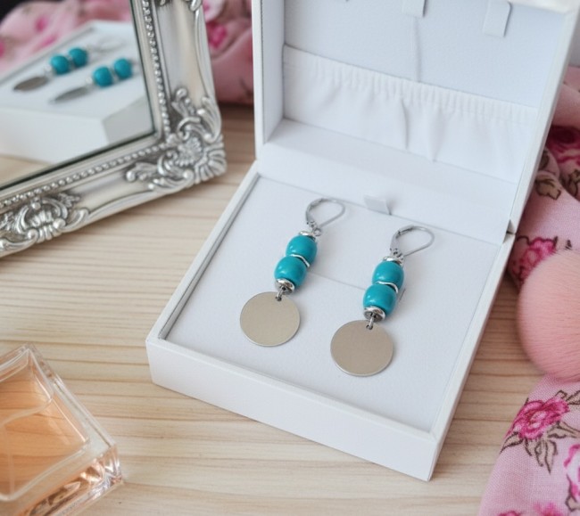 Boucles d'oreilles acier inoxydable, sequin métal et perles colonnes turquoise