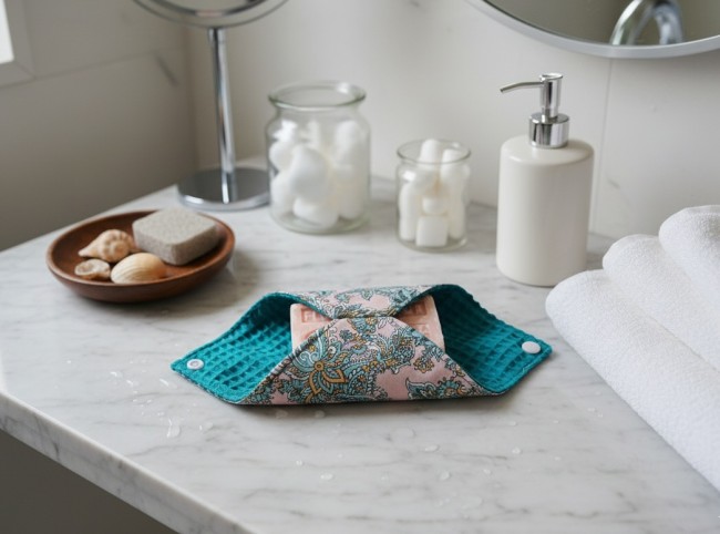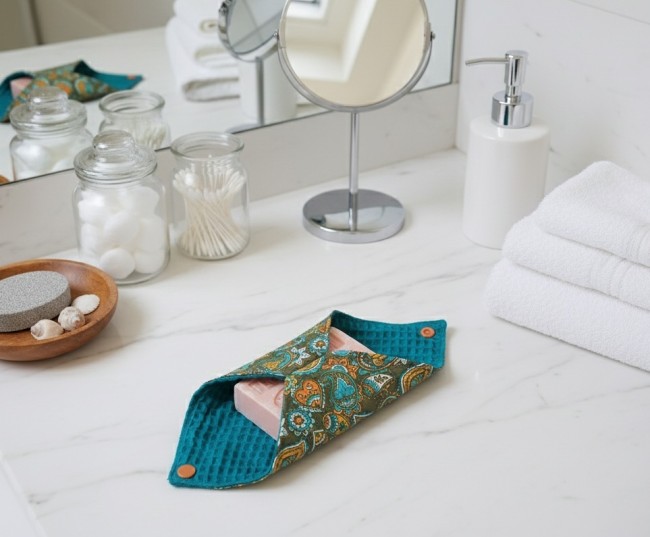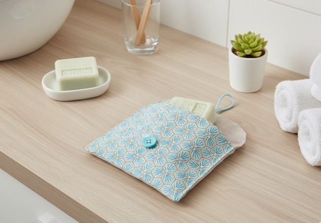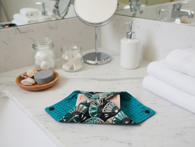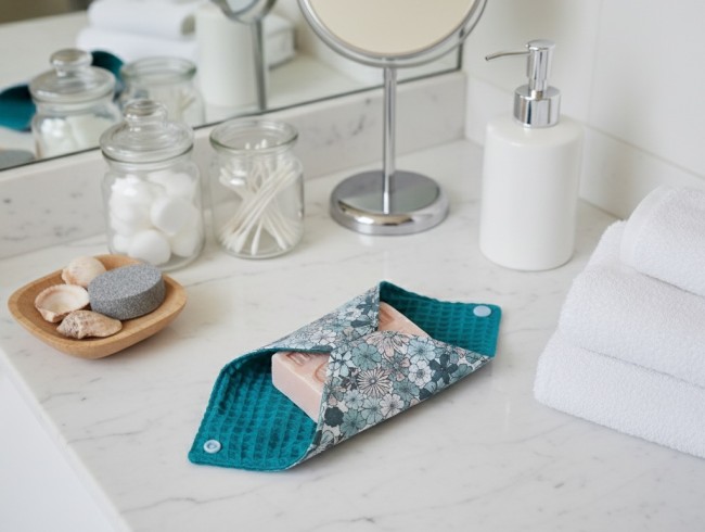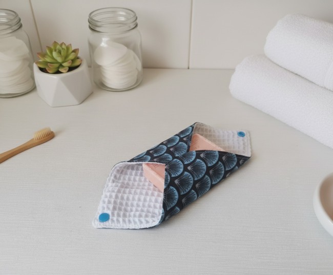 Pochette à savon coton imprimé et nid d'abeille turquoise