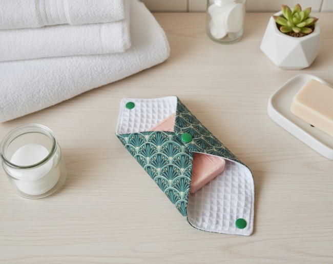 Pochette à savon coton imprimé vert éventail et nid d'abeille blanche