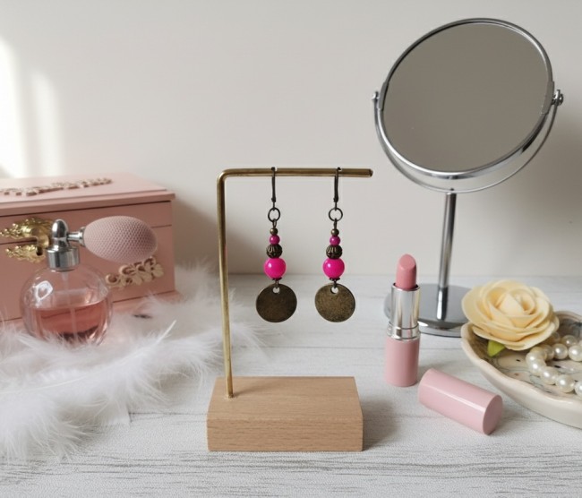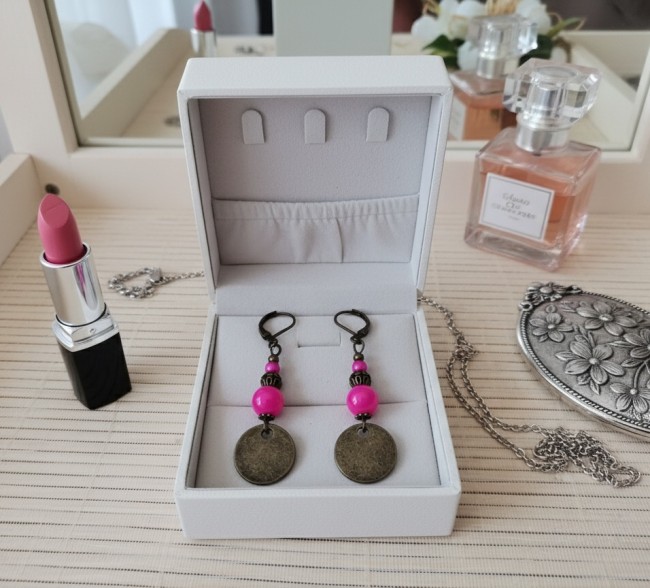 Boucles d'oreilles apprêts bronze et perles en verre ronde fuchsia