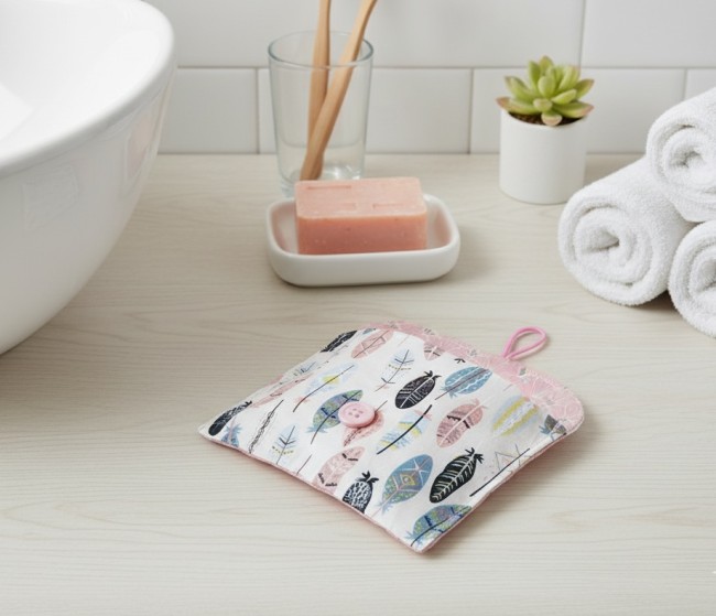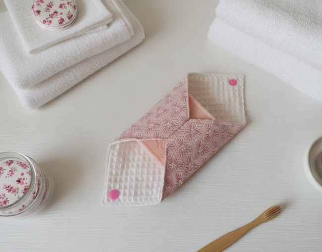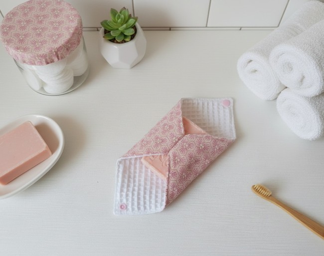 Pochette à savon coton imprimé rose géométrique et nid d'abeille blanche