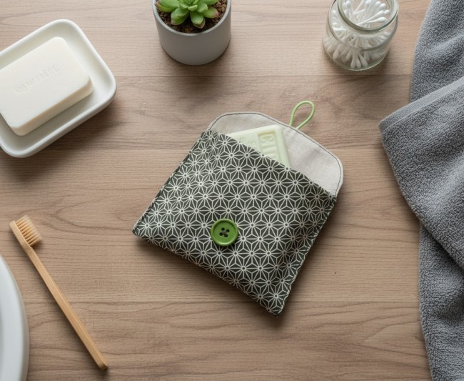 Pochette à savon tissus beige imprimé kaki géométrique et coton enduit beige