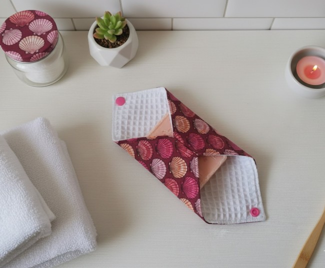 Pochette à savon coton imprimé bordeaux coquillages et nid d'abeille blanche