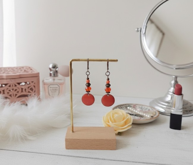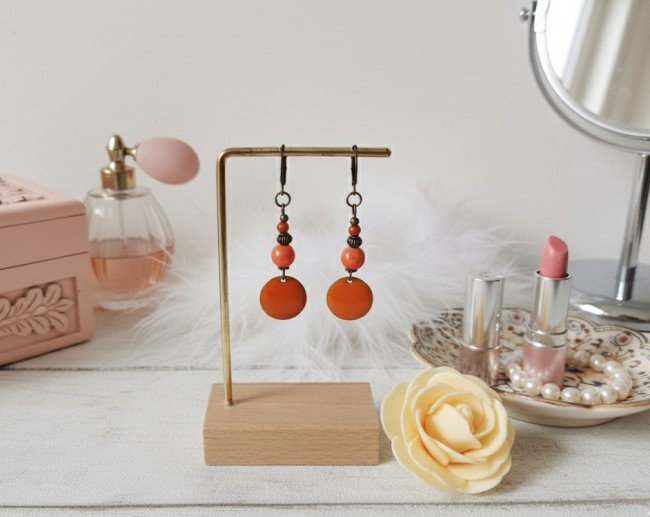Boucles d'oreilles apprêts cuivre et sequin émail corail