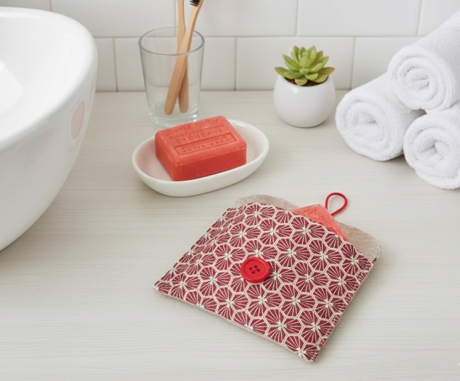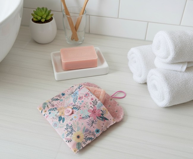 Pochette à savon tissus saumon imprimé fleurs et coton enduit rose