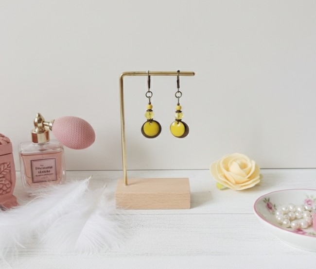 Boucles d'oreilles apprêts bronze et sequin émail jaune