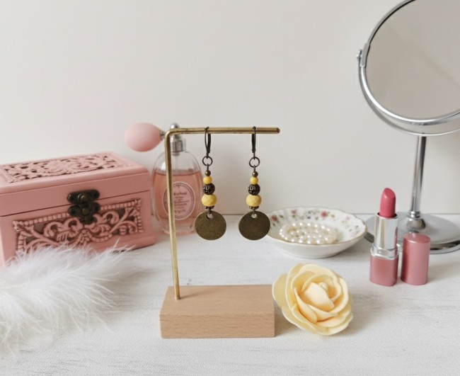Boucles d'oreilles apprêts bronze et perle en verre moutarde imitation jade