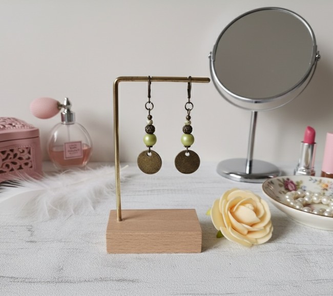 Boucles d'oreilles apprêts bronze et perles en verre ronde vert anis